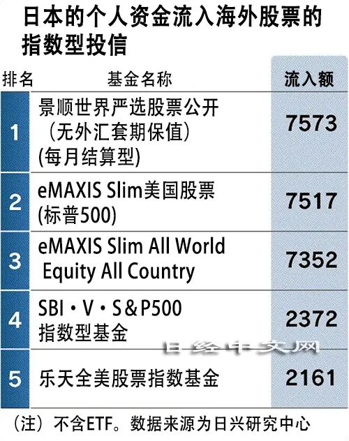 日兴研究中心(Nikko Research Center)的推算显示,海外股票的指数投信的流入金额为3.5684万亿日元,占整体流入金额的5成以上。