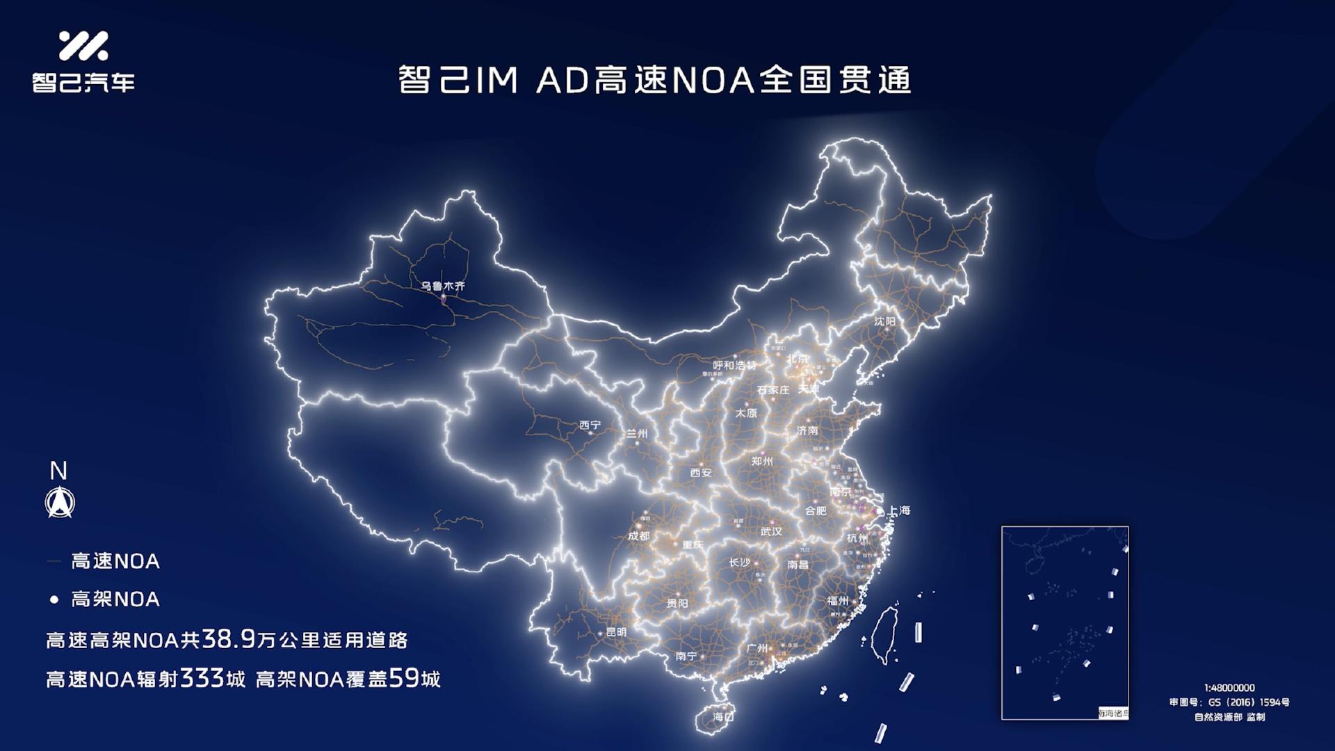 去年12月,智己汽车官方宣布智己IM AD 高速高架NOA全新登陆9省28市,实现辐射全国333城的高速路段(除港澳台地区外),并覆盖59城高架路段;高速高架NOA适用道路总计38.9万公里。