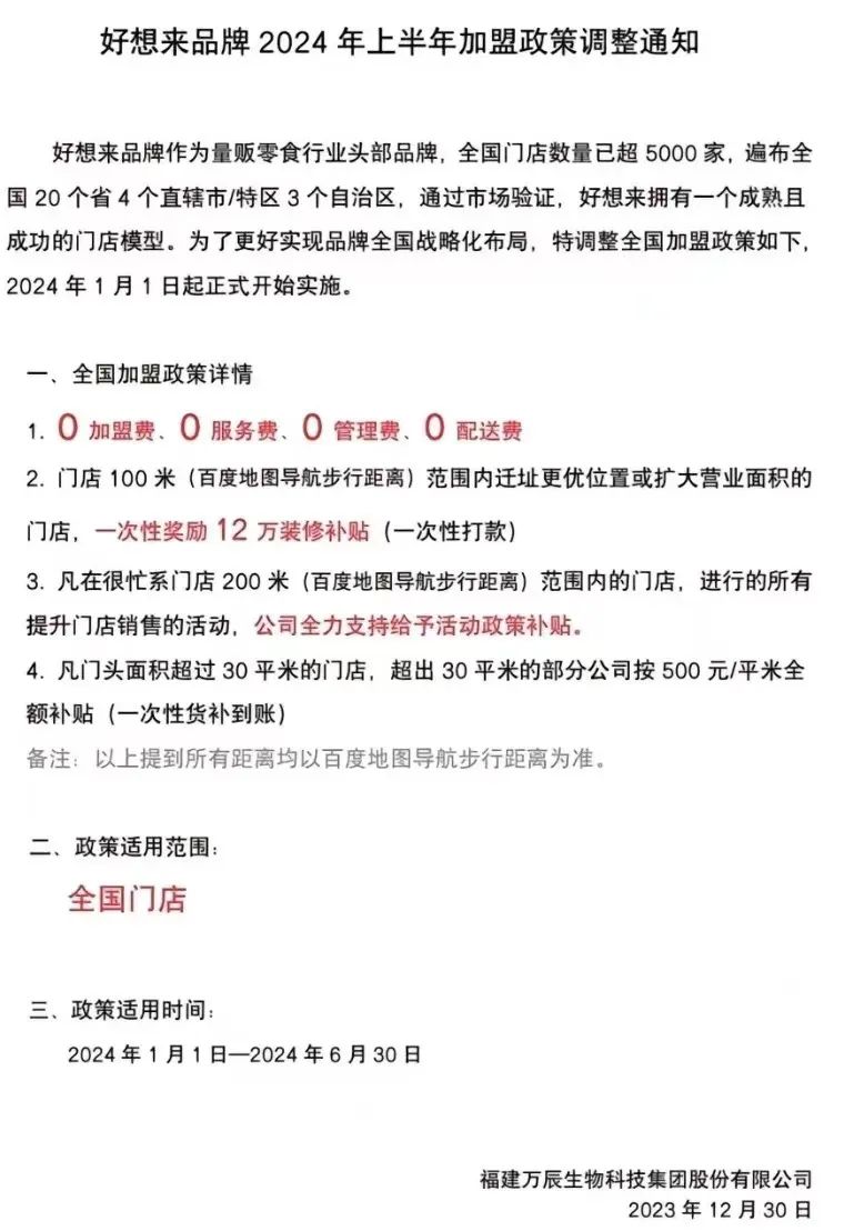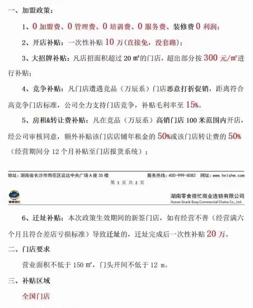 发布北上计划当天,零食很忙也对外公布了新一轮的加盟政策,具体包括:2024年1月22日-4月30日,所有加盟零食很忙和赵一鸣零食的加盟商,均可享有0加盟费、0管理费、0培训费、0服务费、装修费0利润;开店一次性补贴10万元;门店招牌面积超过20平方米的,超出部分按300元/平方米补贴;如遇万辰系竞品门店恶意打折促销,距离符合高竞争门店标准,补贴毛利率至15%;凡在万辰系竞品高销门店100米内布店,经公司审核同意,额外补贴50%的年租金或50%的转让费;另外还有迁址补贴,即本轮新签门店后续如若因经营不善导致迁址,迁址完成后一次性补贴20万。