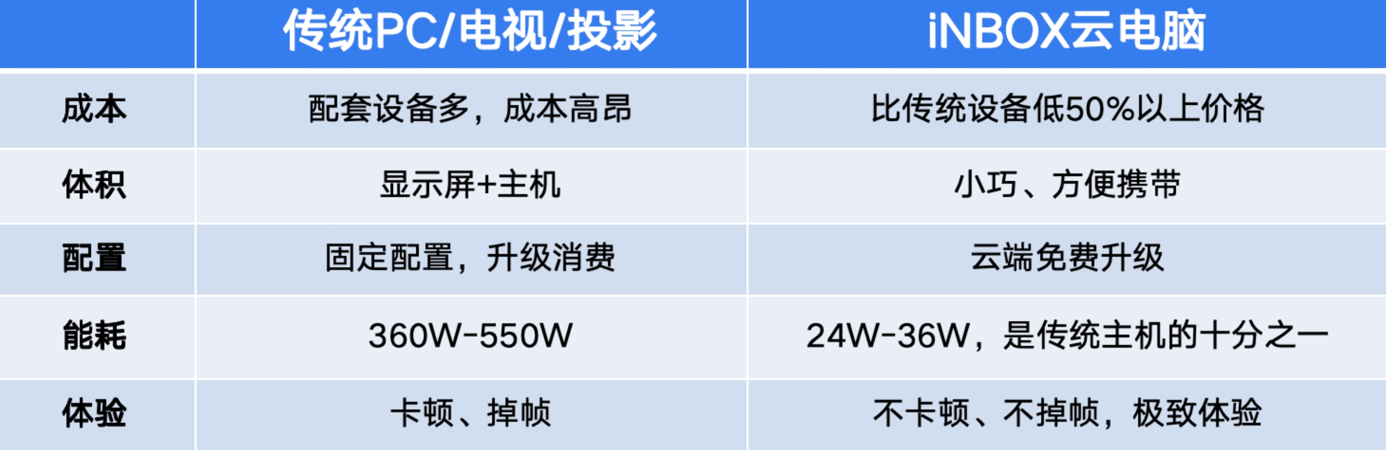 从用户端来看,iNbox提供了许多差异化体验。即可本地免费使用,又可付费上云使用,轻办公需求时,用户可以直接使用本机电脑;当需要升级为高配电脑,进行大型作图渲染,畅玩大型3A游戏时,再进行相应云付费即可——相当于在房间内便能实现网吧包厢体验。