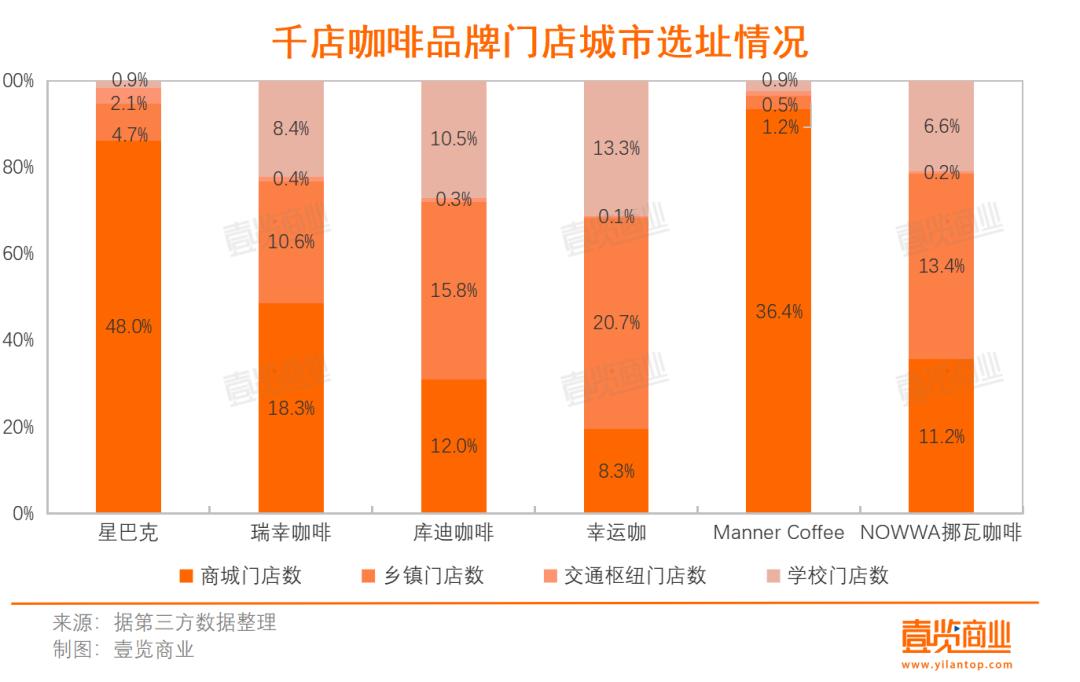 在城市选址,以及不同线级城市的门店分布上,可以窥见连锁咖啡品牌们的策略规律。壹览商业选取星巴克、瑞幸、库迪、幸运咖、Manner咖啡以及挪瓦咖啡六家千店品牌作为代表,来分析其各自的门店分布策略。