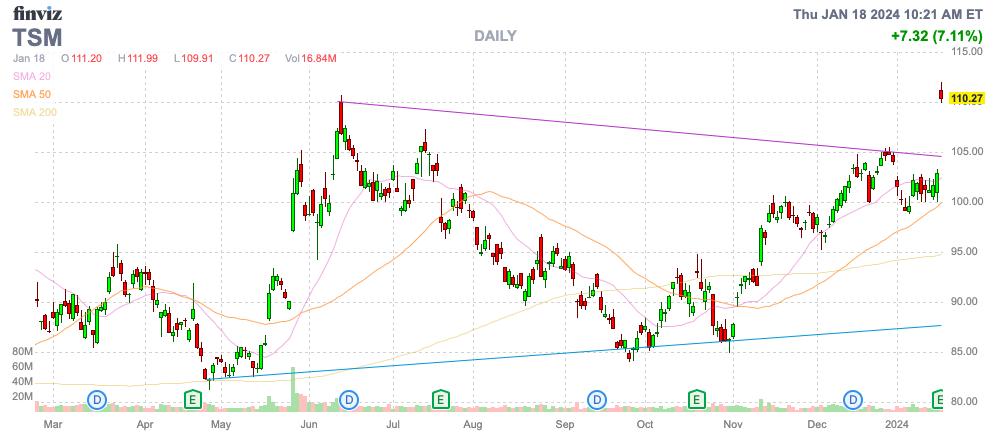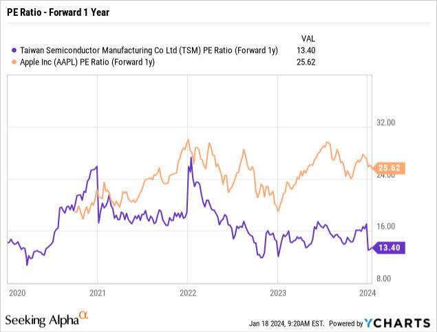 台积电的股价因强劲的盈利和2024年增长超过20%的指导而飙升至110美元。即使在这一举措之后,该芯片公司的市盈率也仅为预期每股收益目标的14.4倍,而苹果的市盈率仍为25.6倍。
