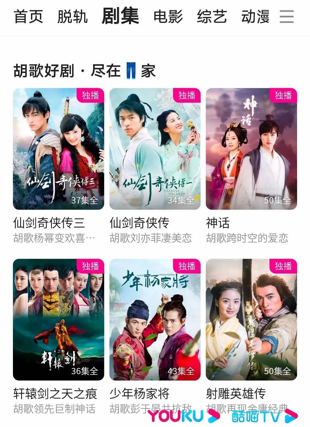 除了《仙剑奇侠传》系列一三五,其中包括像胡歌主演的《轩辕剑》、《天外飞仙》等古装剧也是优酷独播;还有被无数观众反复“打磨”的宫斗剧《甄嬛传》,优酷也从乐视手中拿到播放权;近期,电视剧《知否知否应是绿肥红瘦》在五周年之际,版权回归优酷独播。