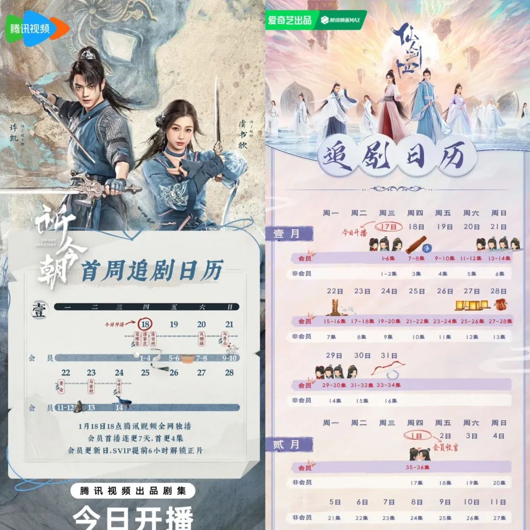 从播出节奏来看,《仙剑四》以会员用户首播六集,每日更新两集的节奏,到2月1日会员收官;《祈今朝》首周会员首播连更7天,首更4集,并且在会员更新的基础上,推出了SVIP提前6小时解锁正片。二者档期几乎重合。