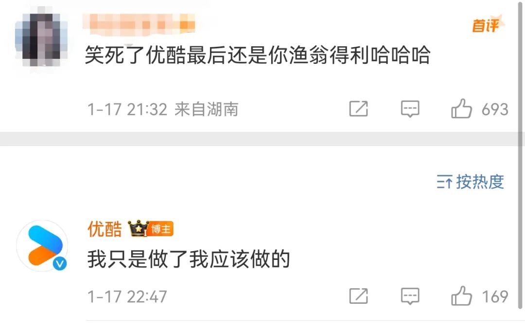 有网友在评论区留言:“优酷最后还是你渔翁得利。”优酷官微还回复评论表示:“我只是做了我应该做的”。