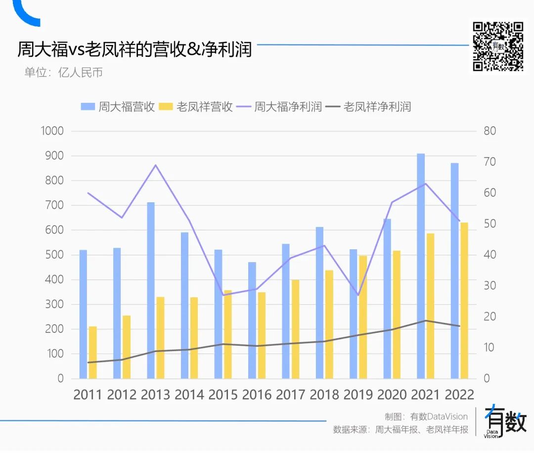 对于2010年前后的周大福来说,品牌历史和知名度是有了,收入规模也比老凤祥要大一些,但在门店网络上还差得远。