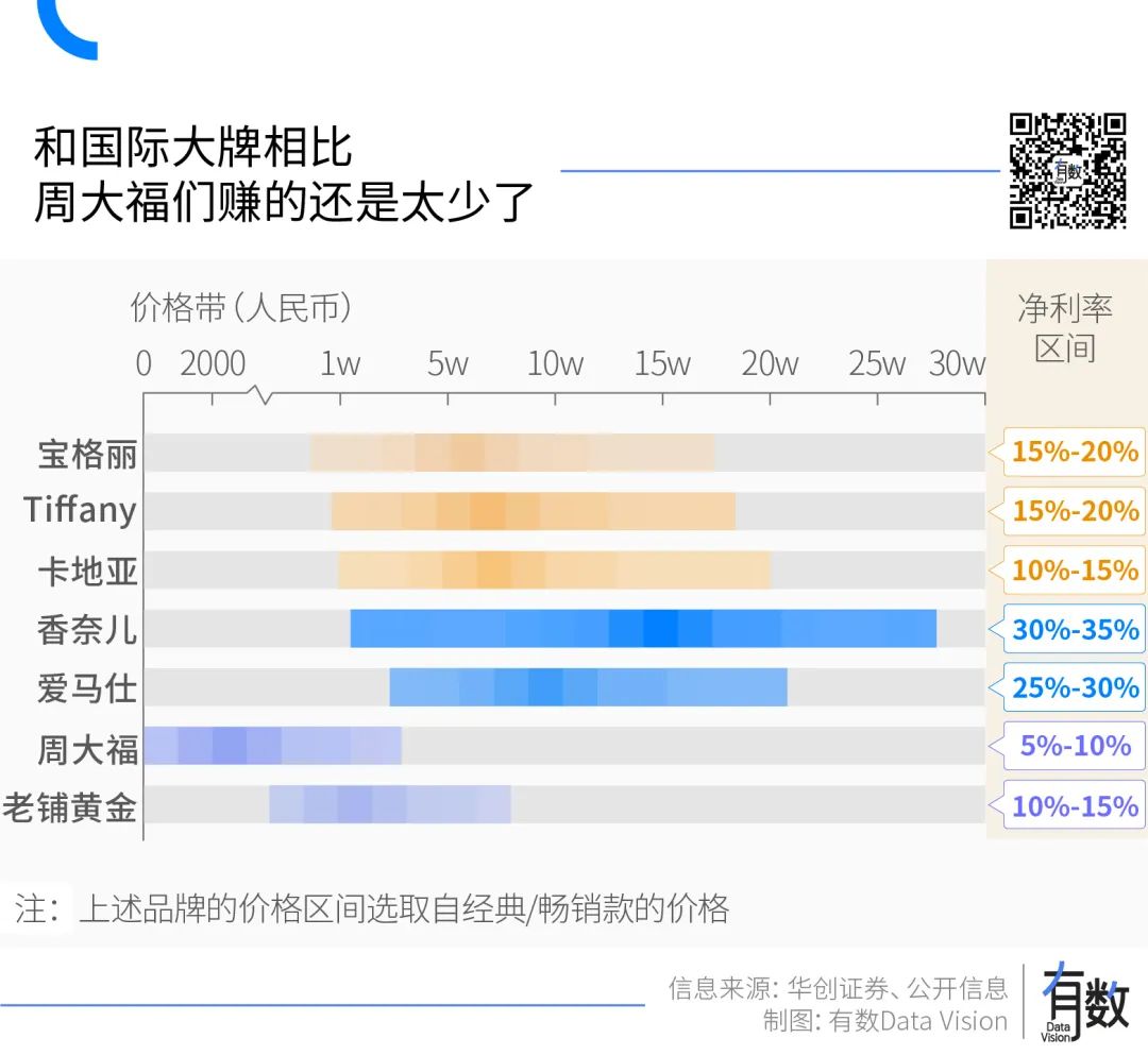 纵然周大福们构筑起的规模高墙难以逾越,但若论盈利能力,周大福和卡地亚等一众国际大牌相比,只能算是个小角色。