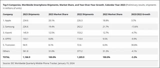 全球范围内,手机市场表现也难言乐观。根据IDC公布的数据显示,2023年全球智能手机市场同比下降3.2%,降至11.7亿部,创下了近十年来全球智能手机市场的出货量新低。