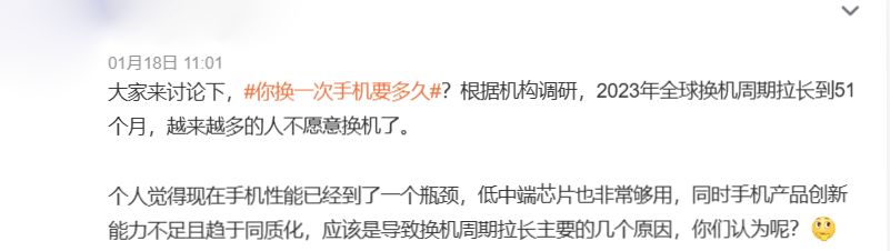 具体到什么程度呢,去年全球的消费者换机周期延长到了历史最长的「51个月」,相当于平均每个人4年多点才换一次手机。