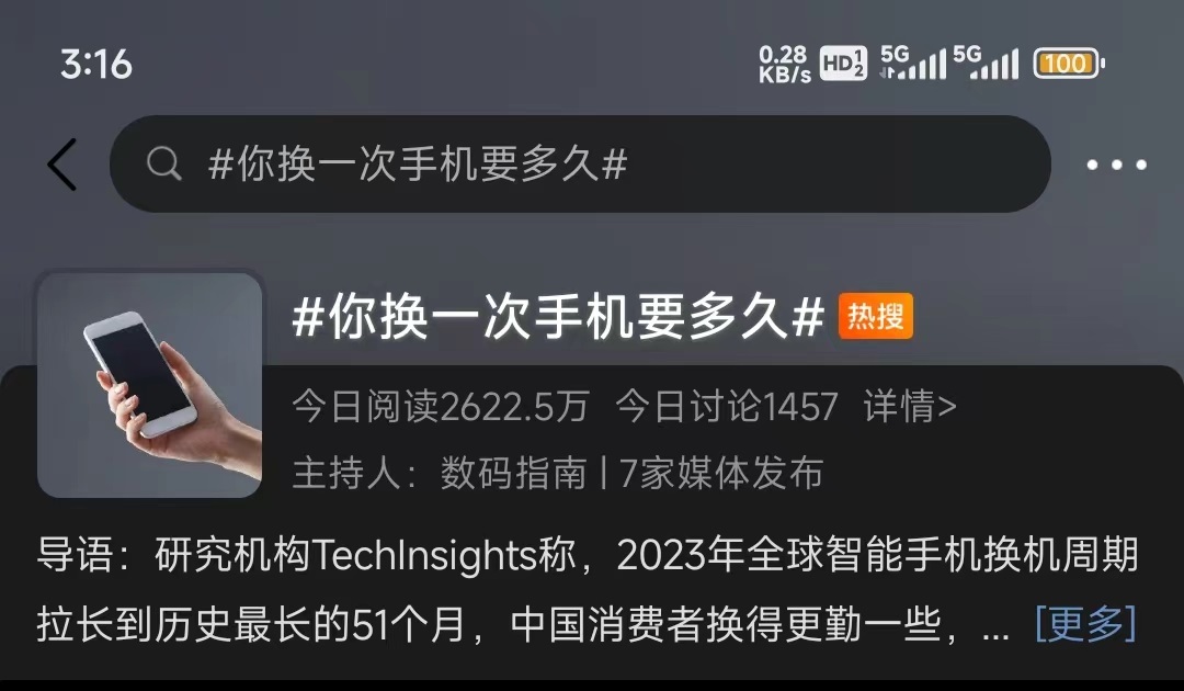 不过,从2023年手机市场的数据,以及“不爱换手机”的微博热搜来看,手机厂商在创新上依然任重道远,只有继续搞出一些更创新的功能,做出让用户有更强烈感知的体验升级,甚至实现从量变到质变的提升,他们才愿意 “买新不买旧” 。