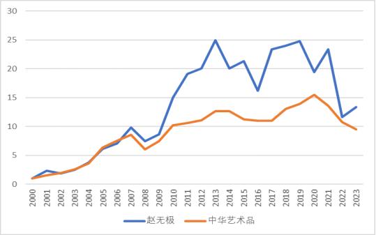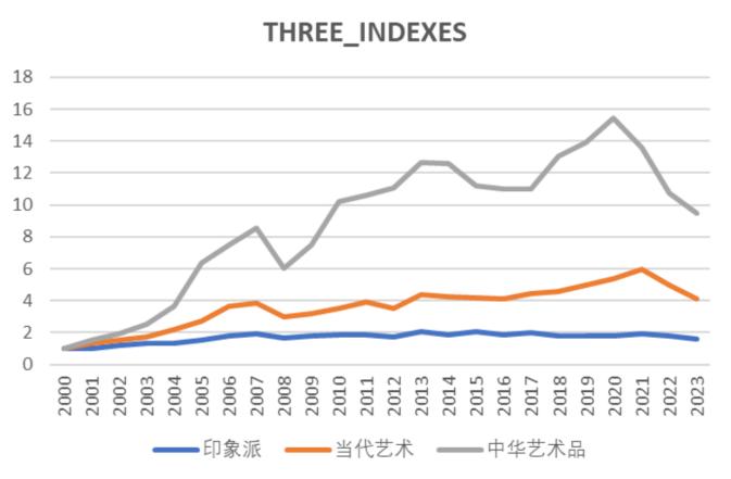 中华艺术品价格指数显示,受疫情等多重因素影响,2023年市场跌幅11.7%,幅度较过去两年趋缓,中华艺术品市场的恢复仍然需要时间。不过,自2001年至2023年末,该指数年复合增长率为10.3%,跑赢了印象派价格指数2.1%和以欧美艺术家为主的ARTDAI当代艺术品价格指数6.4%。