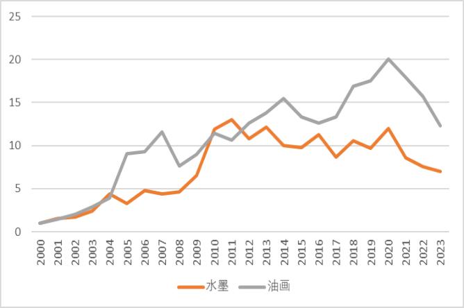 自2009年后在各种政策刺激下,水墨指数出现了较快增速,从5%上升至12%,最高到13%,一度曾跑赢油画指数。但在2012年到达高点以后,便处于缓慢下行的走势。2001至2023年期间,油画指数年化收益率11.5%高于水墨指数,但水墨画亦有不俗的投资收益率为8.8%,同时,水墨指数的波动性低于油画指数。