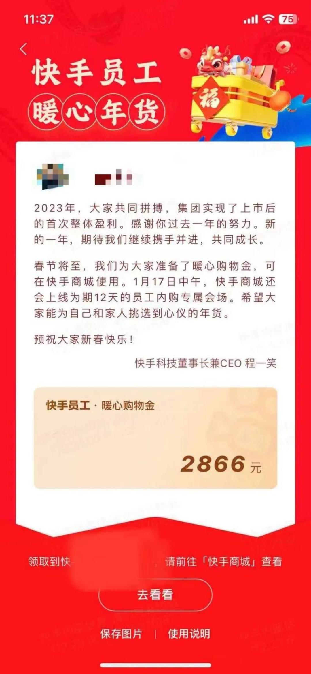 日前,快手CEO程一笑通过内部信宣布快手实现上市后首次整体盈利,为感谢员工过去一年的努力付出,将向员工派发最高为2866元暖心购物金。据了解,工龄满三年(含)以上员工可获得2866元暖心购物金,其他员工也将获得数额不等的暖心购物金。