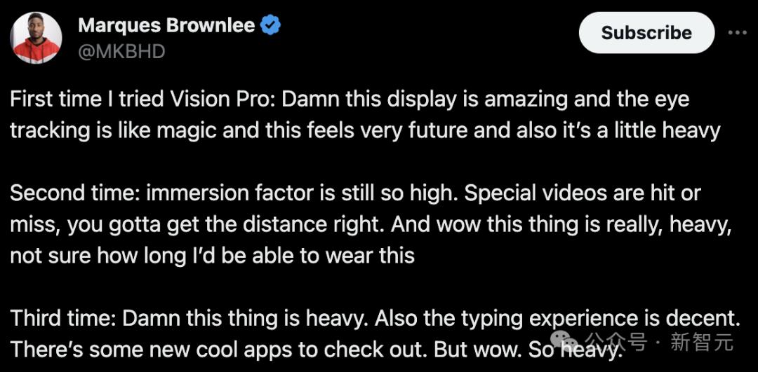 国外知名科技博主Marques Brownlee就曾吐槽说,Vision Pro什么都好,就是太重了。