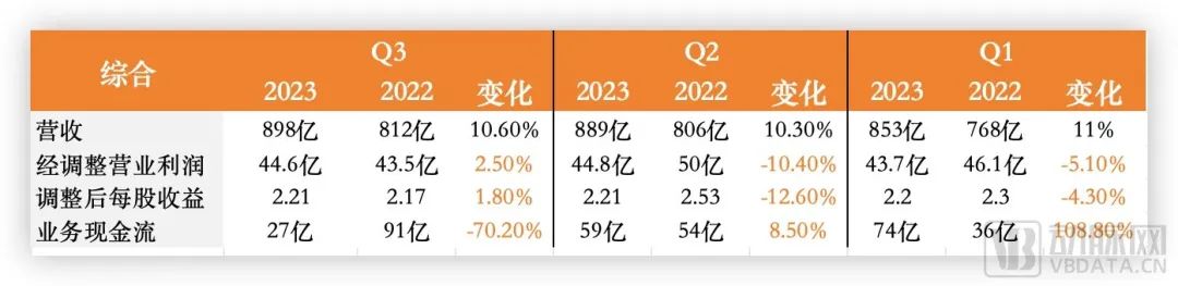 尽管2023年的整体营入还在增长,但利润却不见长。从财报数据中可以看到,Q1和Q2,调整后营业利润同比分别降低5.1%和10.4%,到了Q3虽然同比略有上涨2.5%,但环比来看,并未呈现上升迹象。