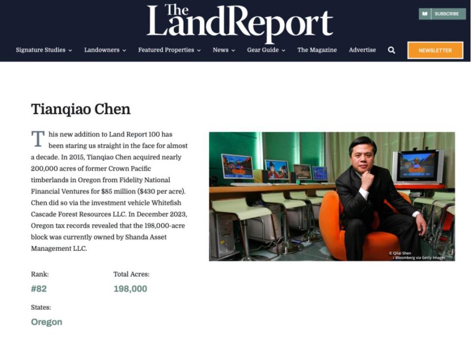 有媒体报道,曾经的中国互联网教父、盛大网络的创办人陈天桥在俄勒冈州拥有一片面积达198000英亩(约800平方公里)的林地。因此这位中国商人成为了美国排名第82位的“地主”,同时也是美国的第二大外籍土地拥有者。有媒体计算,这片土地的面积相当于整个纽约市或4.5个华盛顿,在中国面积则直接超过了北京五环。