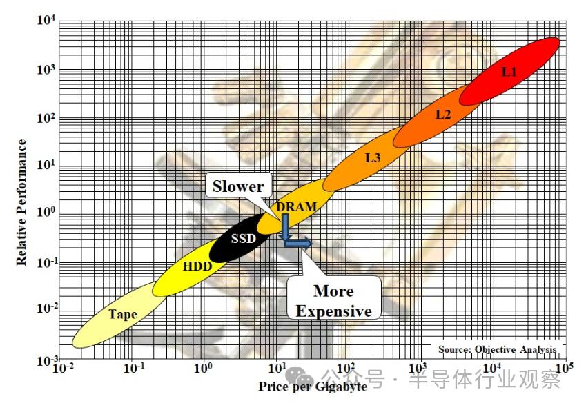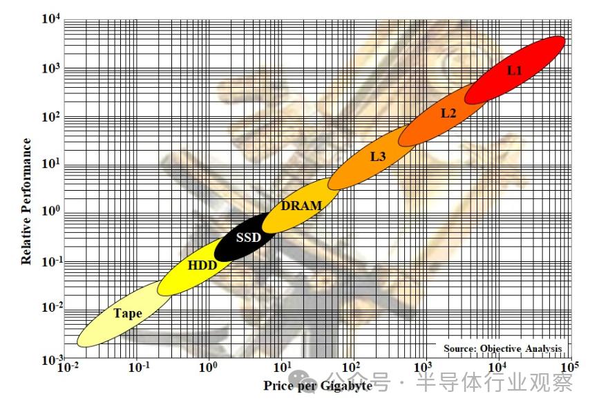 了解这一点重要性的一个好方法是查看我们在许多演示中展示的 Objective Analysis 内存/存储层次结构图。SSD Guy 的博客文章对此进行了详细描述,因此我仅在此展示而不解释: