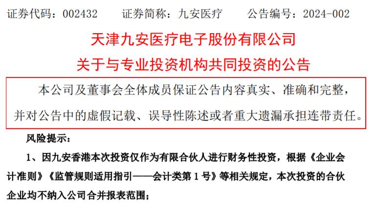 此前在1月17日,九安医疗发布公告称,公司全资子公司Andon Hong Kong Co., Limited(简称“九安香港”)将与另一创投企业“海棠创投”合作,共同设立九棠创投。其后,九棠创投将与海棠创投合作共同设立创投公司九棠一号。九棠一号将作为出资主体向“天开九安海河海棠基金”进行出资。
