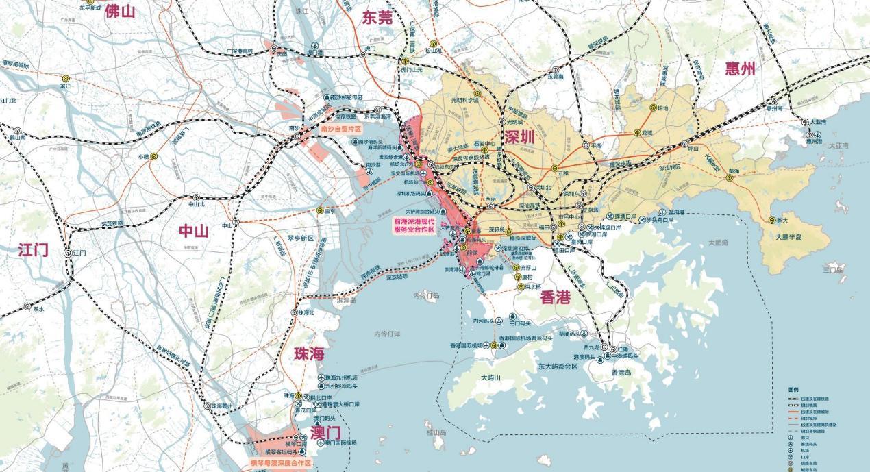 前海的地理位置非常的优越,特别是扩区以后,有6个港口码头,1个国际的机场,8条轨道交通线,红色区域就是前海整体的空间范围,整体来说,如果说大湾区9个城市是非常好的圆形城市圈,前海有得天独厚的优势,刚好处在这个中轴线的位置,到各个地方都非常的便捷和快速。接下来,前海还会专门设一条西部快轨的铁路,直接连通到香港。蛇口码头已经有到香港机场、深圳湾口岸到香港也非常近,而接下来还修一条铁路快轨,将直接通到香港洪水桥口岸。