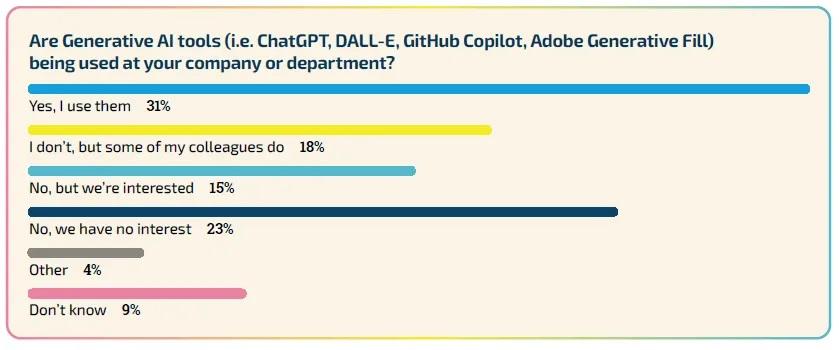 实际上,《幻兽帕鲁》只不过揭开了游戏行业“灰色地带”的一角。最近游戏开发者大会 (Game Developers Conference,GDC)主办方组织了一项针对3000多名游戏开发人员的调查,结果显示超过30%的人已经依赖生成式AI,近50%的人并不反对将生成式AI用于游戏开发。在部分国内从业者看来,游戏更是AIGC最好的应用场景之一。随之而来的,则是一场愈来愈严峻的版权危机。