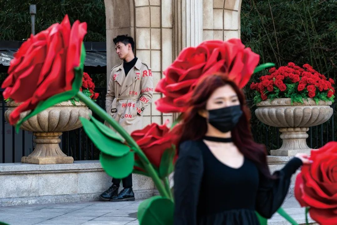 2023年2月13日,北京。路人在巨型“玫瑰”布景装置旁留影。(图/侯宇/中新社)