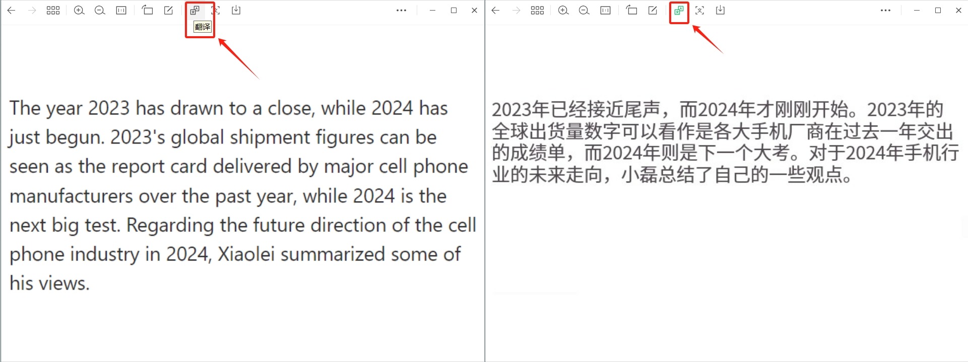 翻译也是同样操作,点击「翻译」按钮翻译英文为中文,再点击翻译按钮则显示回原文。