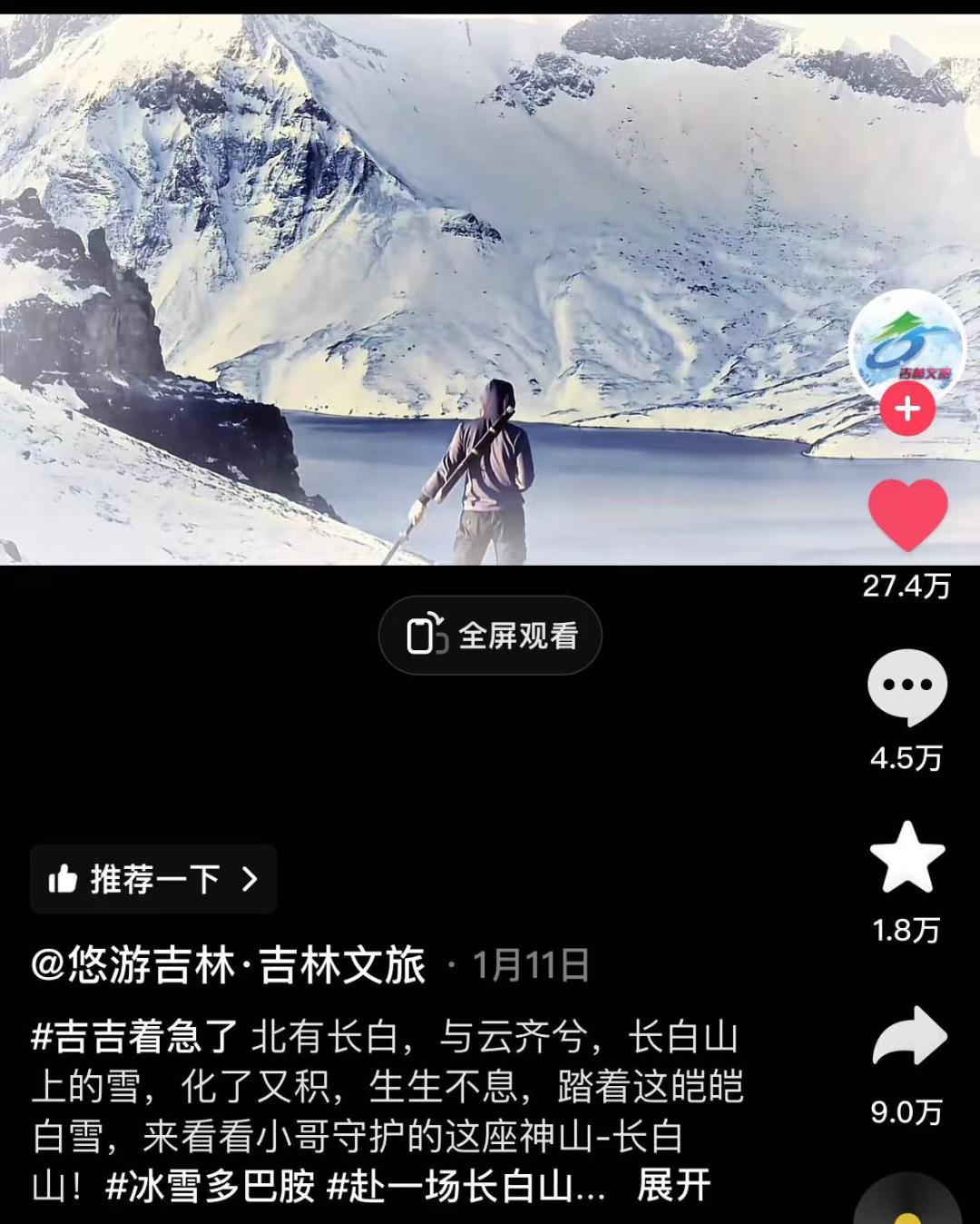比如吉林就直接搬出《盗墓笔记》瓶邪的十年之约,“北有长白与云齐兮,长白山上的雪,化了又积,生生不息,踏着这皑皑白雪,来看看小哥守护的这座神山—长白山”。原著中张起灵走入青铜门后,约定与吴邪十年后在长白山见面。吉林文旅的该条视频在抖音点赞超27.4万,此前账号其余视频的点赞数在几千到几万条不等,足以说明IP化的影响力。