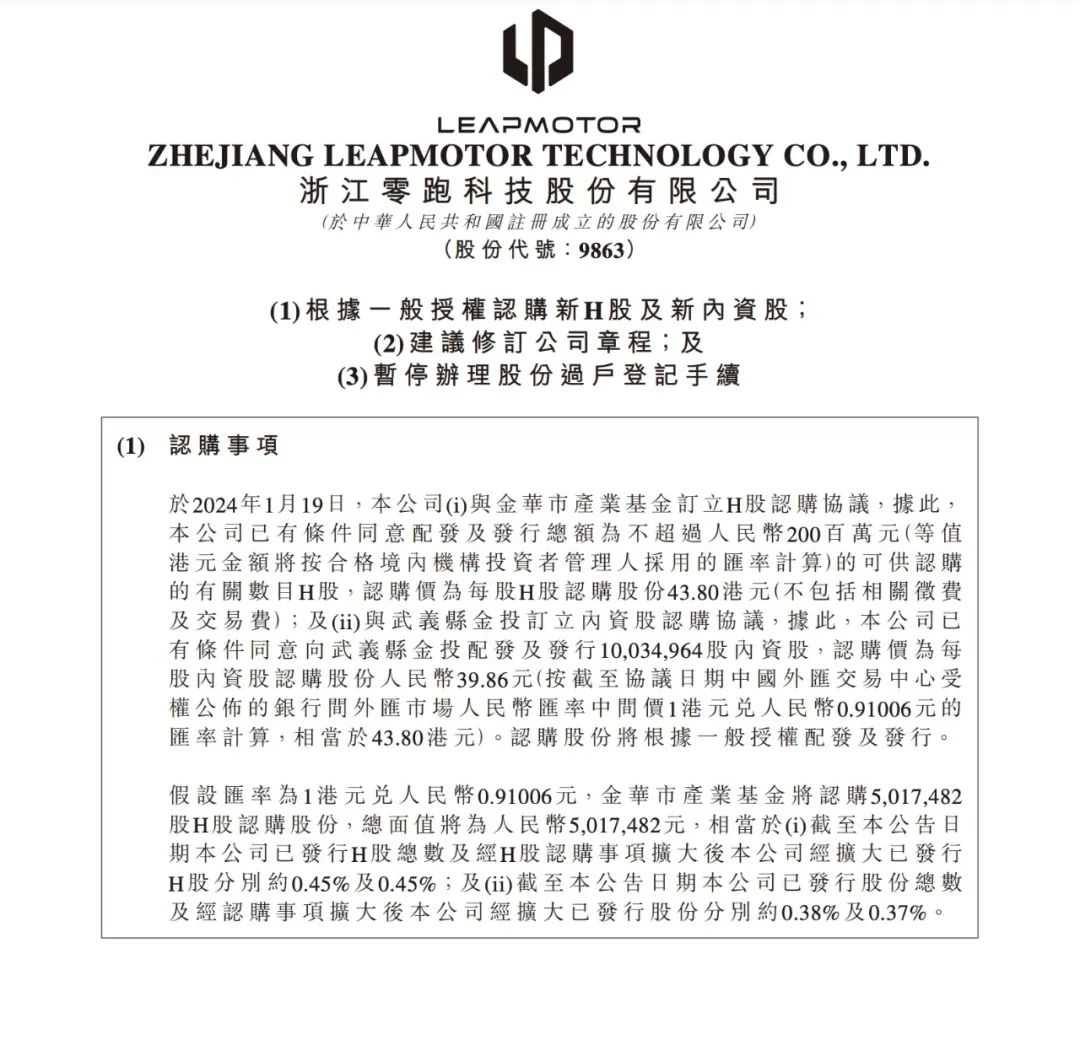 此外,零跑汽车还与武义县金投订立内资股认购协议。据此,零跑汽车已有条件同意向武义县金投配发及发行1003.5万股内资股,认购价为每股内资股认购股份39.86元(根据最新汇率计算,相当于43.8港元)。认购股份将根据一般授权配发及发行。