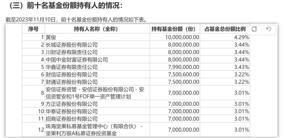 从前十名基金份额持有人情况来看,过半数均为券商,另外还有部分券商资管产品、私募产品、个人等。