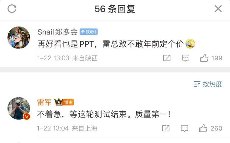 36氪获悉,1月22日,有网友在雷军微博下评论“雷总敢不敢年前定个价”。雷军回应称:“不着急,等这轮测试结束。质量第一!”