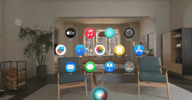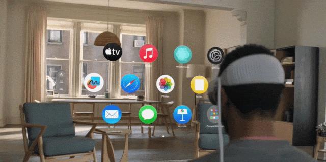 当佩戴者打开Vision Pro的主页视图时,就能发现上面有各种可供使用的APP,可以通过盯着某个图标,然后再捏合双指即可来选中。