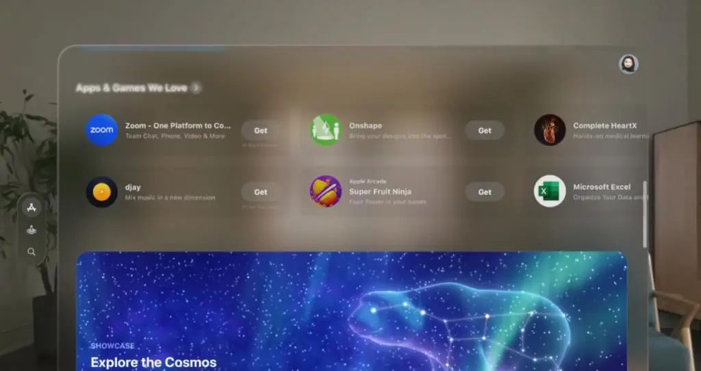 在视频最后还飞速展现了一下visionOS 的App Store应用商店,可以看到 Disney+、Zoom、Microsoft Excel / Word 等应用,以及《死亡细胞》等游戏。