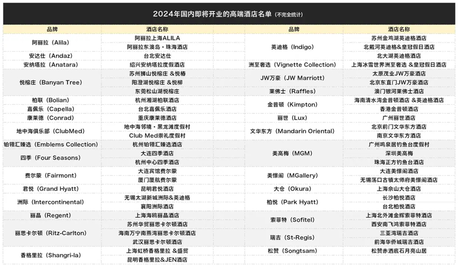 根据媒体和酒店集团官网发布消息整理2024年国内即将开业的高奢酒店名单