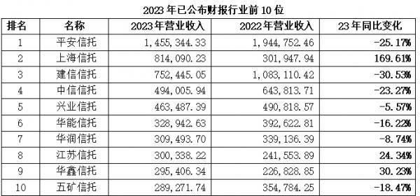 云南信托研报指出,52家信托公司营业收入总额981.73亿元,同比下滑11.26%。已经披露年报的52家信托公司中,仅47.05%的公司营业收入呈现正增长;行业营收前5位分别为平安信托、上海信托、建信信托、中信信托、兴业信托;行业营收前10位中,上海信托、江苏信托、华鑫信托3家公司营收同比分别上涨169.61%、24.34%、30.23%。
