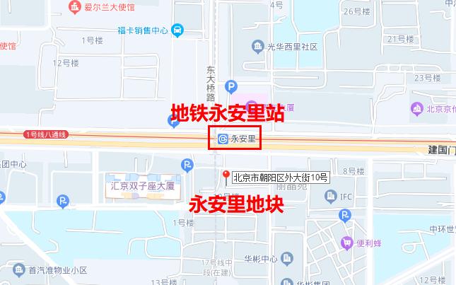 地块位置在东二环外永安里站南侧约100米,西侧是双子座大厦,向东一站建国门,向西一站是国贸。