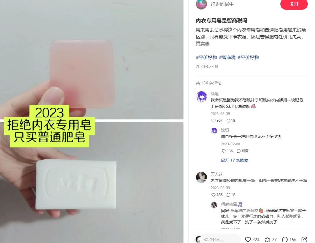 一块普通的肥皂卖三五块,一块洗内衣裤专用肥皂就要卖到20元左右。除了颜色不同以及带点香味,这些层出不穷的洗内裤皂清洁力度甚至不如硫磺皂来得猛。朋友小杨告诉我,自己也知道“洗内裤皂”可能是智商税,但就是“想把洗袜子的肥皂和洗内裤的区分开”。