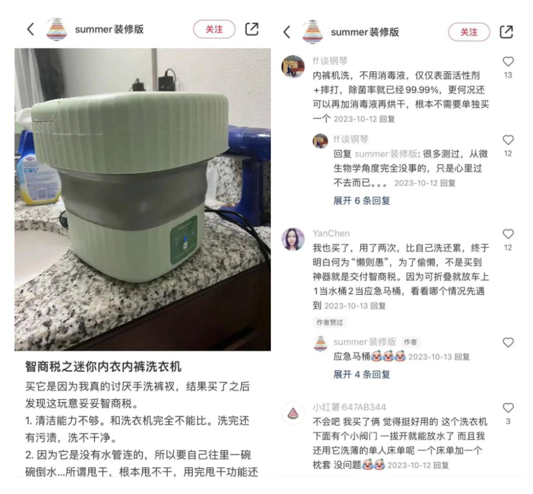 但往往“冲冠一怒为内裤”的结局就是落在旁边吃灰。本来为了图个方便洗得更干净狠下心花了钱,后来到手发现没有水管相连需要自己重新布局水路、清洁力度也不够时常需要返工、买来不到一个月修了三次,更扎心的是发小红书吐槽一下,还会收到评论——醒醒吧,买这个洗衣机的钱足够买很多条新内裤了。