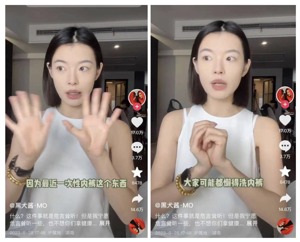 去年夏天,百万级粉丝博主黑犬酱·MO分享自己因穿一次性内裤得了妇科病一事,激起千层浪。虽说没有直接点名道姓说出导火索品牌,但也不难从黑犬酱话里话外“怕律师函”、“希望视频能保留下来”听出是一个相对有规模的商家。