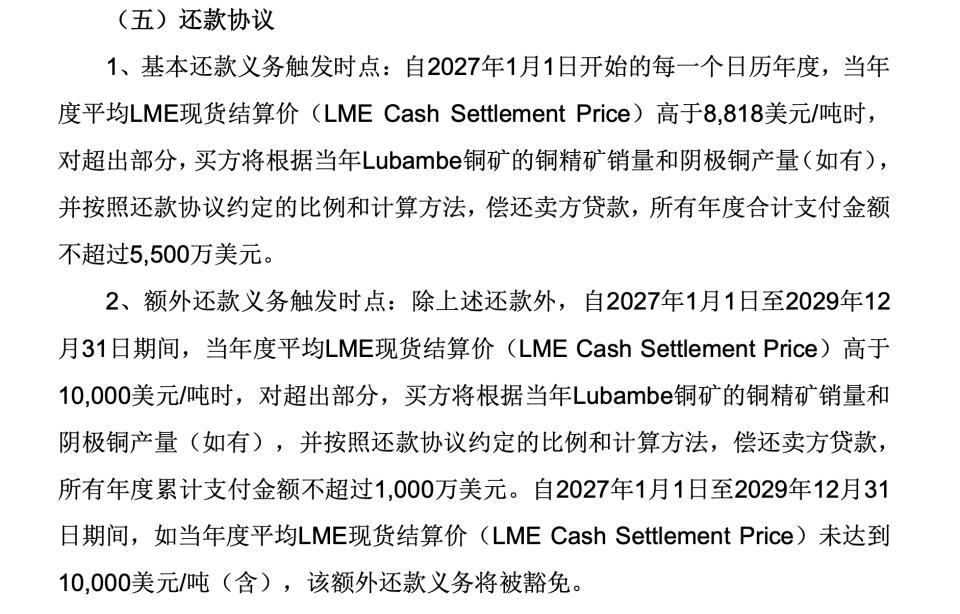 同时,根据双方还款协议,是否偿还贷款、偿还贷款的比例不仅与LCML的业绩相关,还取决于届时铜价的上涨空间。如果LME现货结算价涨得多,金诚信子公司还需要多还钱。