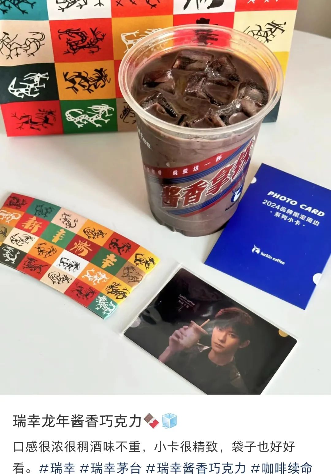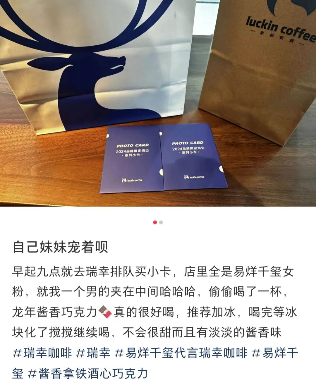 2023年11月27日,瑞幸咖啡官宣易烊千玺成为其全球品牌代言人。2024年1月22日起,购买瑞幸咖啡专属套餐产品,即可获赠周边系列小卡。其中,就包括购买两杯龙年酱香巧克力,赠送一张易烊千玺小卡盲盒;买三杯,赠送两张易烊千玺小卡盲盒。