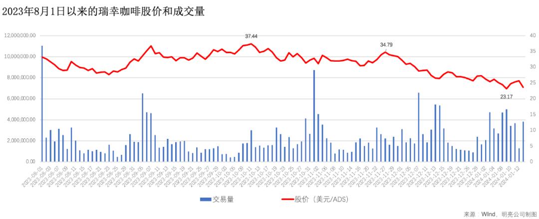 不过,自2023年11月以来,瑞幸股价一直成下降趋势,截至1月22日收盘,瑞幸市值为63.07亿美元,较10月11日103.3亿美元下降近四成。