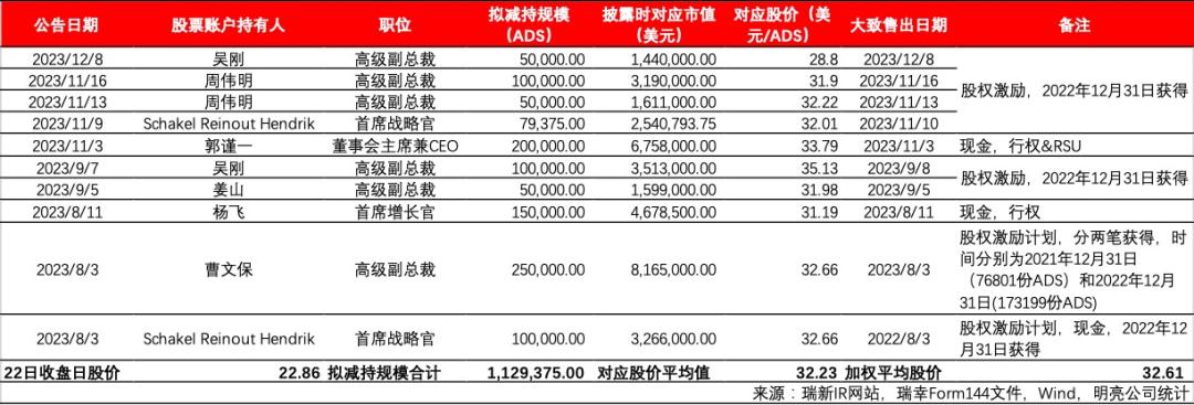 「明亮公司」查阅瑞幸官网,自2023年第二财季季报披露(8月1日)以来,瑞幸多次披露了核心关联方的证券出售信息,主要为高管减持,合计减持共计112.94万ADS,减持的加权平均价为32.61/ADS。结合交易量的角度来看,历次拟出售证券的规模远小于平均交易量。