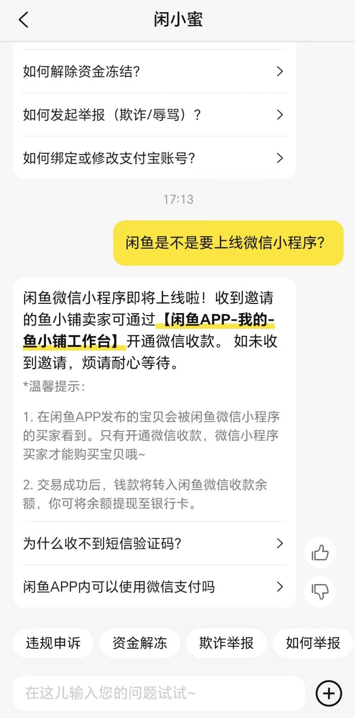 随后,时代周报记者向闲鱼客服求证此事。客服回复称,闲鱼微信小程序即将上线,收到邀请的鱼小铺卖家可通过“闲鱼APP-我的鱼小铺工作台开通微信收款”。