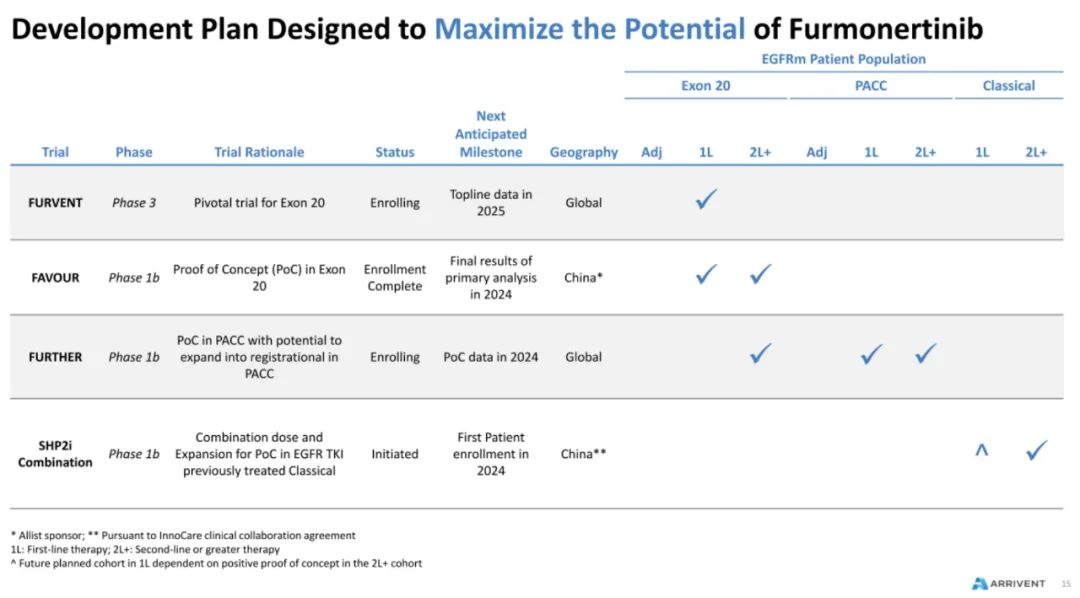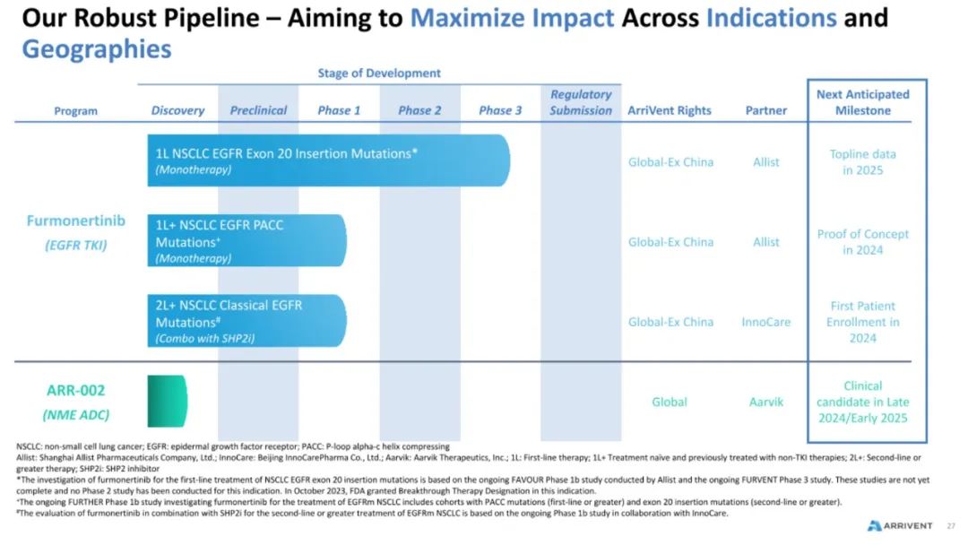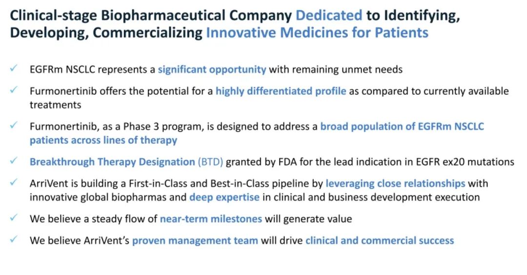 其中,2023年3月,ArriVent完成1.55亿美元B轮融资,本轮募集将主要用于公司核心产品Furmonertinib(一种高透脑率、高特异性的EGFR激酶抑制剂)的关键III期临床研究和其他适应症拓展,并扩充公司的产品管线。
