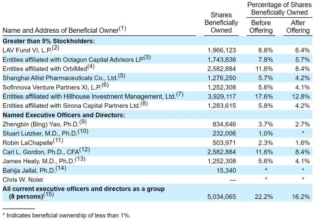 IPO后,LAV Fund VI, L.P.持股为6.4%,Octagon Capital Advisors LP持股为5.7%,OrbiMed持股为8.4%,Shanghai Allist Pharmaceuticals持股为4.2%,Sofinnova Venture Partners XI持股为4.1%;