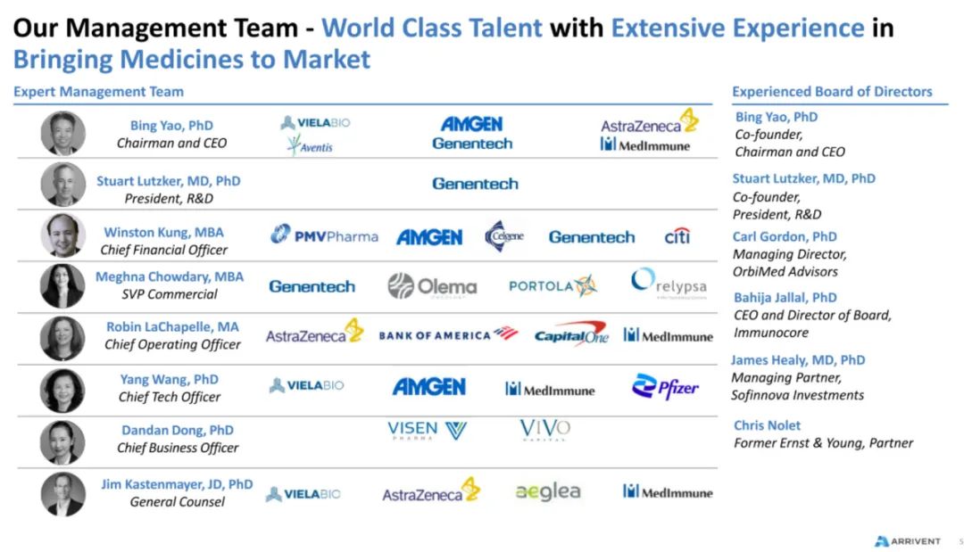 ArriVent董事长、联合创始人兼CEO为姚正彬博士,曾任基因泰克/Genentech与Tanox的高管、阿斯利康(AstraZeneca)高级副总裁,负责免疫肿瘤产品开发、MedImmune高级副总裁,负责呼吸、炎症、与自身免疫疾病创新药物早期开发(iMED);后联合创立Viela Bio。