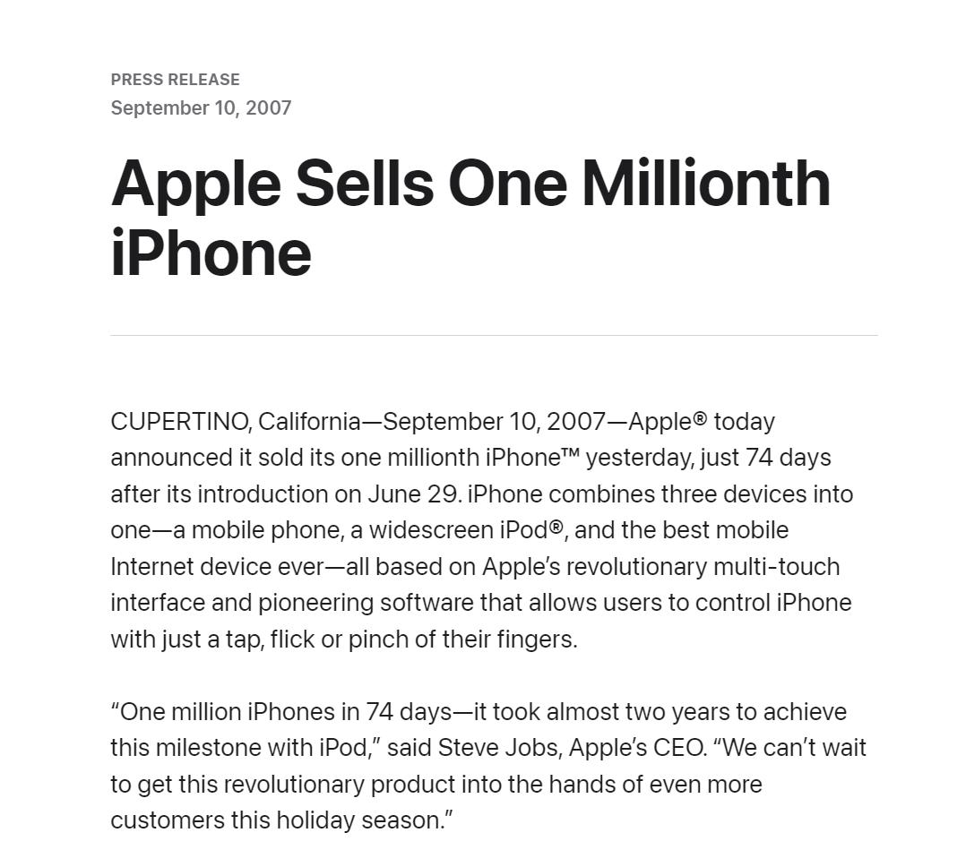 初代 iPhone 为什么可以成功?这一点科技圈反复探讨了十多年。但至少在 2007 年 9 月宣布卖出第 100 万台 iPhone 的苹果看来,iPhone 的成功之处是将移动手机、宽屏 iPod 以及有史以来最好的移动互联网设备「合三为一」——所有这些都基于多点触摸和开创性的软件,「用户只需轻点、轻扫和多次触控就可以控制 iPhone。」