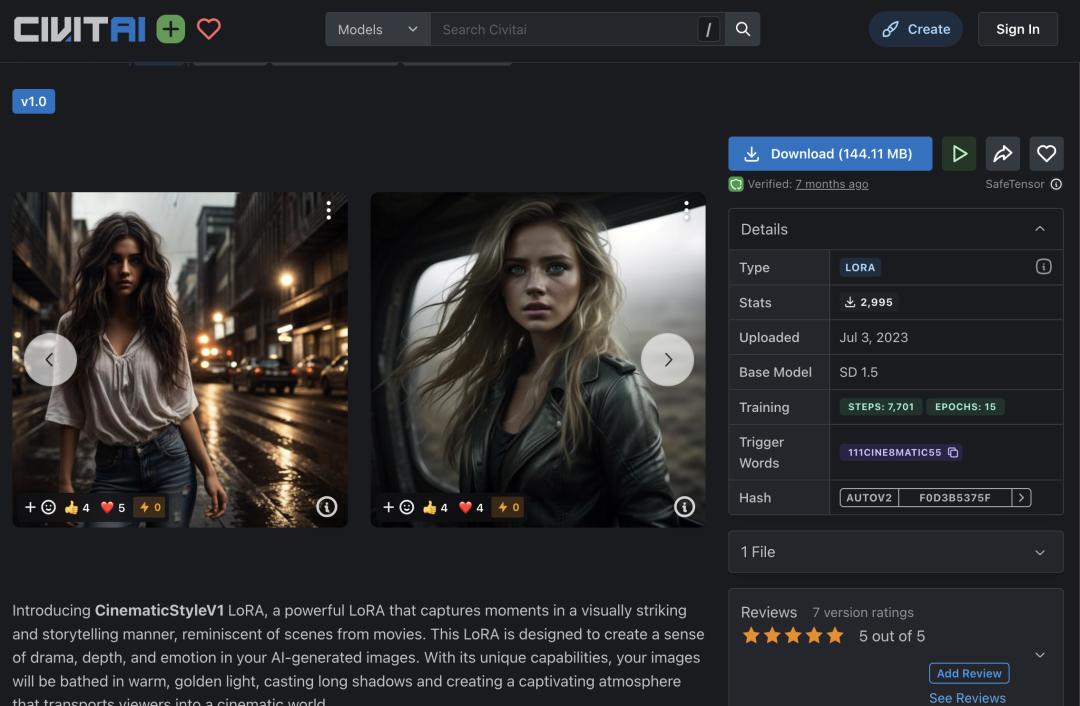 然后找到像FilmVelvia2(用于生成胶片风格AI写真照片)、CineStyle5(用于生成带有故事性的电影图片)这类擅长真人写实风格的模型。