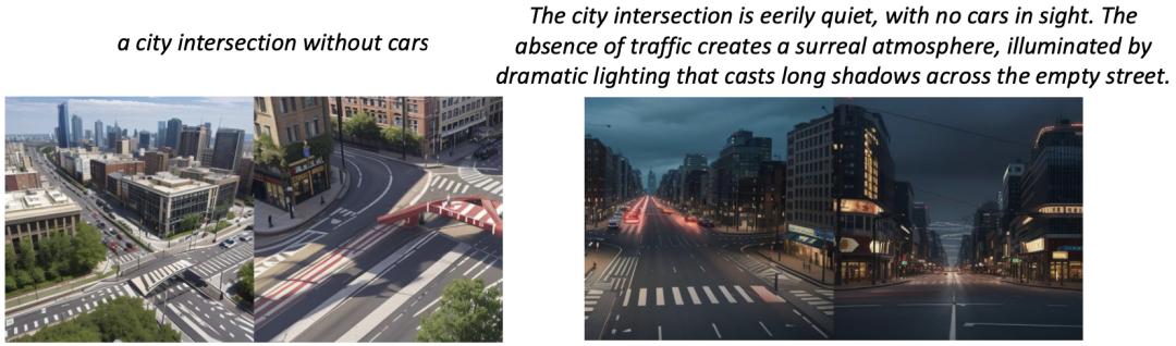 优化prompt:城市的十字路口诡异地安静,到处都看不到车辆。交通的缺失营造出一种超现实的氛围,路灯的照明投下长长的阴影,照亮了空荡荡的街道。
