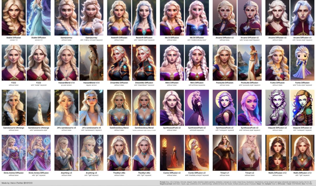 有网友用同一个描述艾莎女王的prompt在不同的模型上进行测试,发现这个画风差距还蛮大的,而差异就源自不同模型用了不同的样本图。